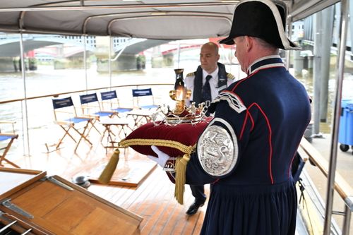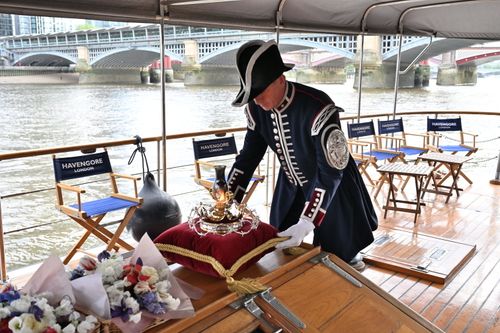 The VE Day 80 Lamp Light of Peace, is a symbolic oil lantern designed to mark the 80th anniversary of Victory in Europe Day. This lantern features a ruby red base, reflecting the sacrifice of those who lost their lives during World War II. It is adorned with a gold and silver crown wrapped in barbed wire, symbolising the hard-won peace that emerged from the conflict, with the crown representing victory and the barbed wire signifying the struggles of war. The lantern sits on a plush red cushion with gold braiding and tassels, emphasising its ceremonial significance.